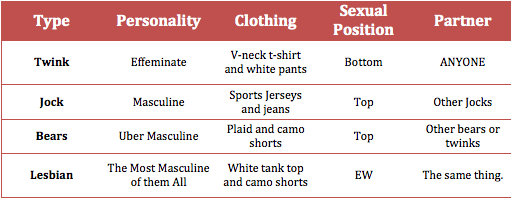 The reason I bring this point up is because I have been thinking about stereotypes a lot lately. I know that the world is filled with them, but at times it seems like the gay world has so many more. If you're gay you fit into a category. It's pretty simple really to outline it all in a table.